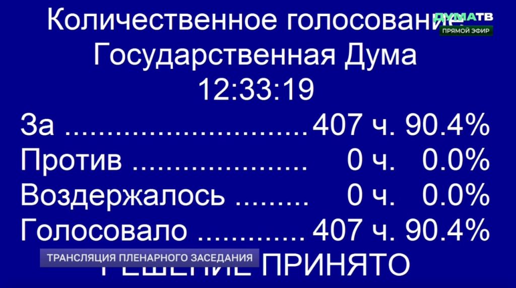 La discusión del instrumento culminó con la votación, en la que de manera unánime 407 diputados se expresaron a favor, sin abstenciones ni votos en contra. Tras la aprobación, el viceministro Serguéi Ryabkov agradeció esta muestra de firmeza y responsabilidad, señalando que “desde Rusia se hace todo lo posible para que, a través de nuestra solidaridad y cooperación con nuestros aliados, especialmente con Venezuela, pongamos un freno sólido a los planes provocadores y a la hegemonía ejercida por Washington”.